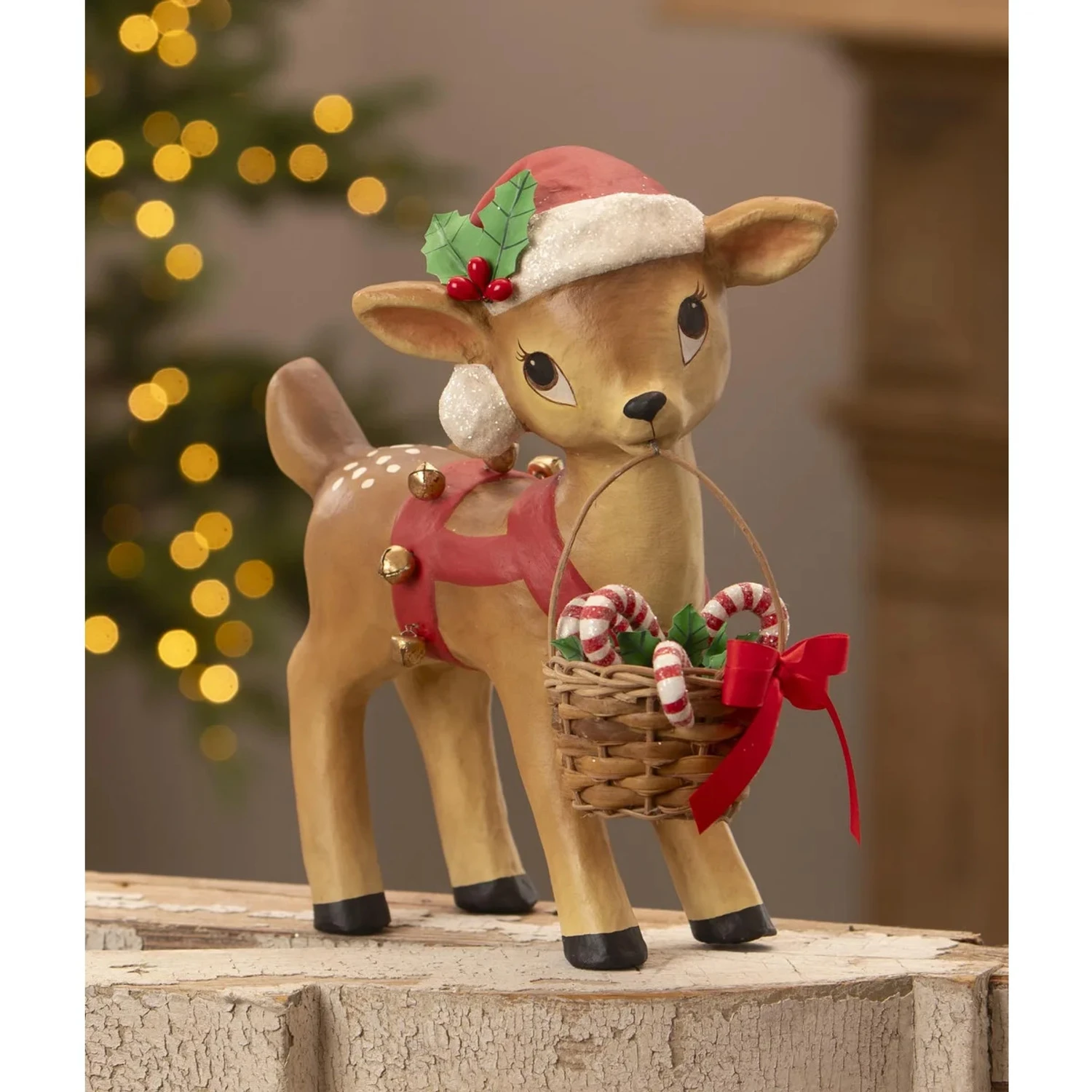 This charming tan deer figure has small white spots on her hind legs with a red harness dotted with gold bells and a red Santa hat! In her mouth is a dangling basket filled with holly leaves and striped candy canes with a red ribbon! This decoration is perfect for your tabletop or entry way this Christmas season. Made by Bethany Lowe. Made of Hand-painted paper mache, basket, faux greenery, resin candy canes, bells, and glitter. Dimensions: 10.25″ X 3.75″ X 10.75″. Item #: TJ3319