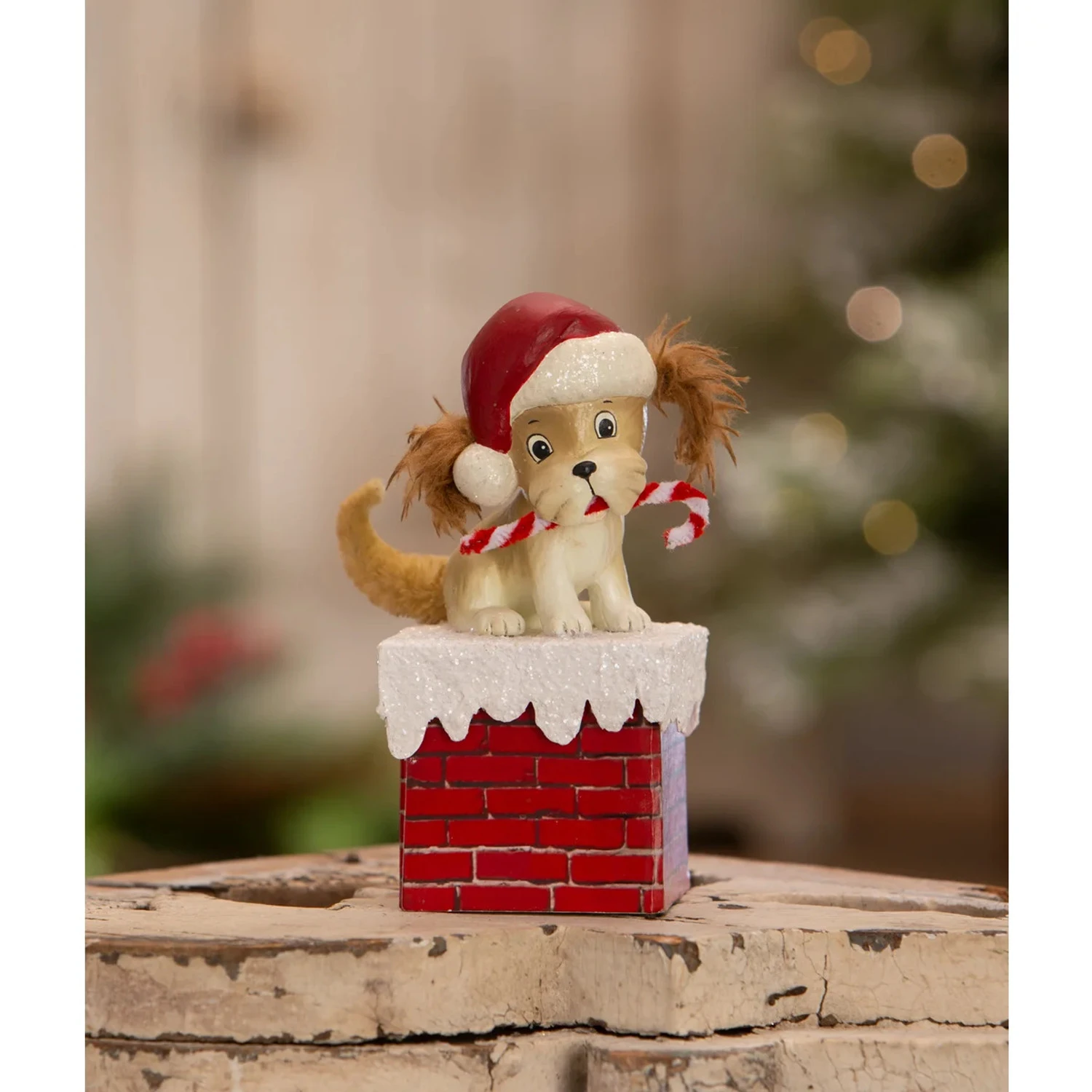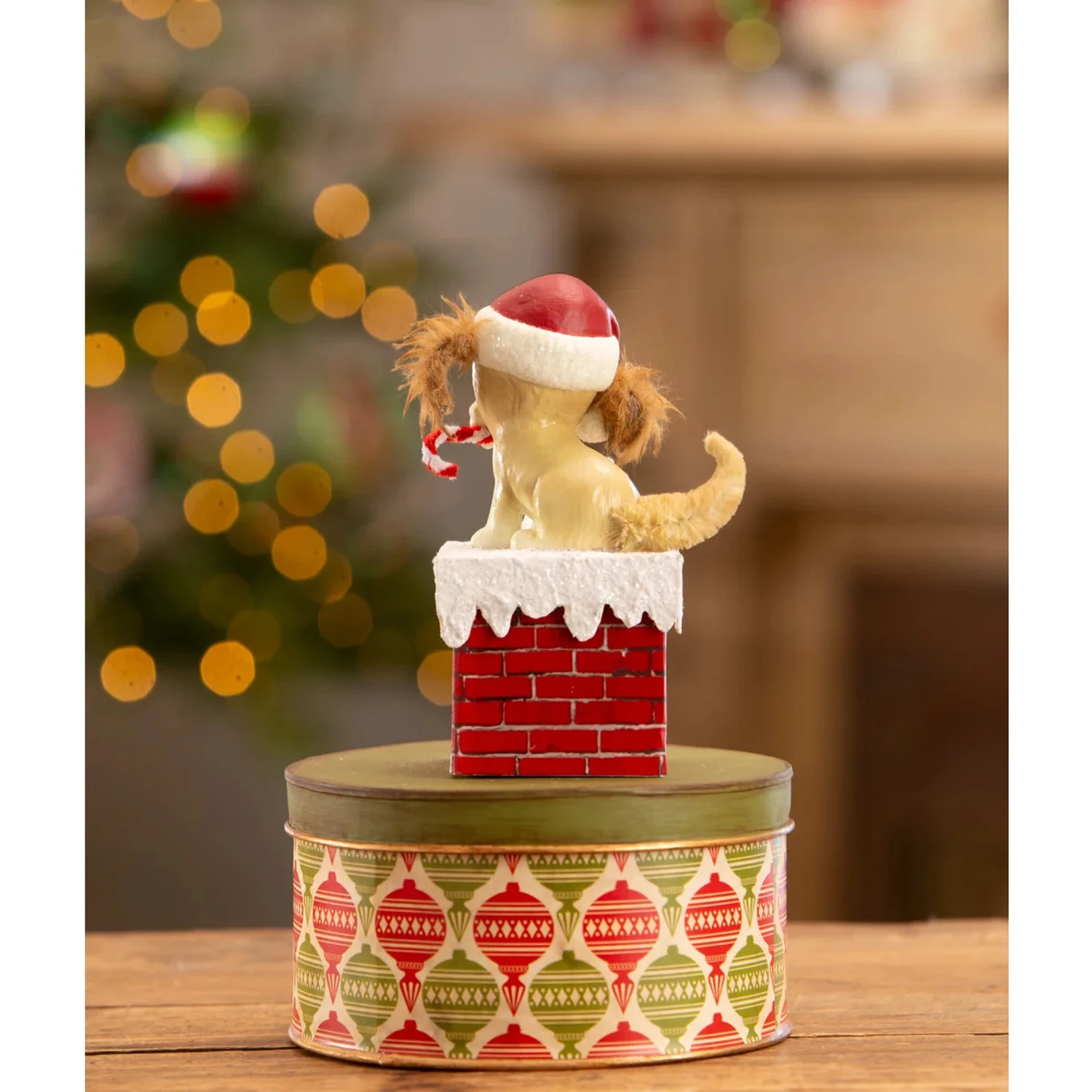Woof! Woof! Looks like someone is getting a puppy for Christmas this years! This adorable pooch has fluffy ears and tail with a red hat on his head and a candy cane in his mouth as he’s perched on top of a red brick chimney! This adorable Christmas box would make a perfect gift or addition to your Christmas decorating. Made by Bethany Lowe. Made of Hand painted resin, chenille, faux fur, glitter, and paper. Dimensions: 2.5″ X 2.5″ X 5.75″. Item #: TL3368