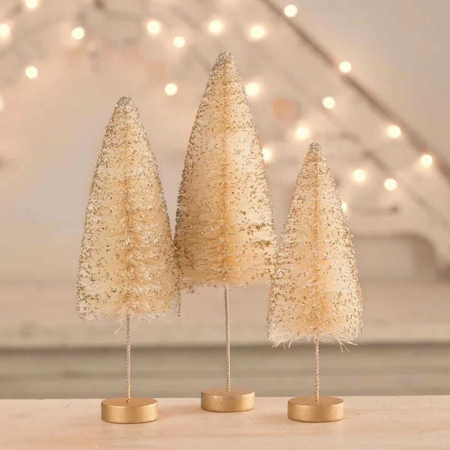 Add these gorgeous trees to the display on your mantle this holiday season for a stunning look! Each one is a creamy ivory tone dusted with gold glitter flakes and a golden metallic base! Sold as a set of 3. Made by Bethany Lowe. Made of bottle brush. Dimensions: 4″ x 4″ x 13″, 3.5″ x 3.5″ x 11.5″, 3″ x 3″ x 10″. Item #: LC1616