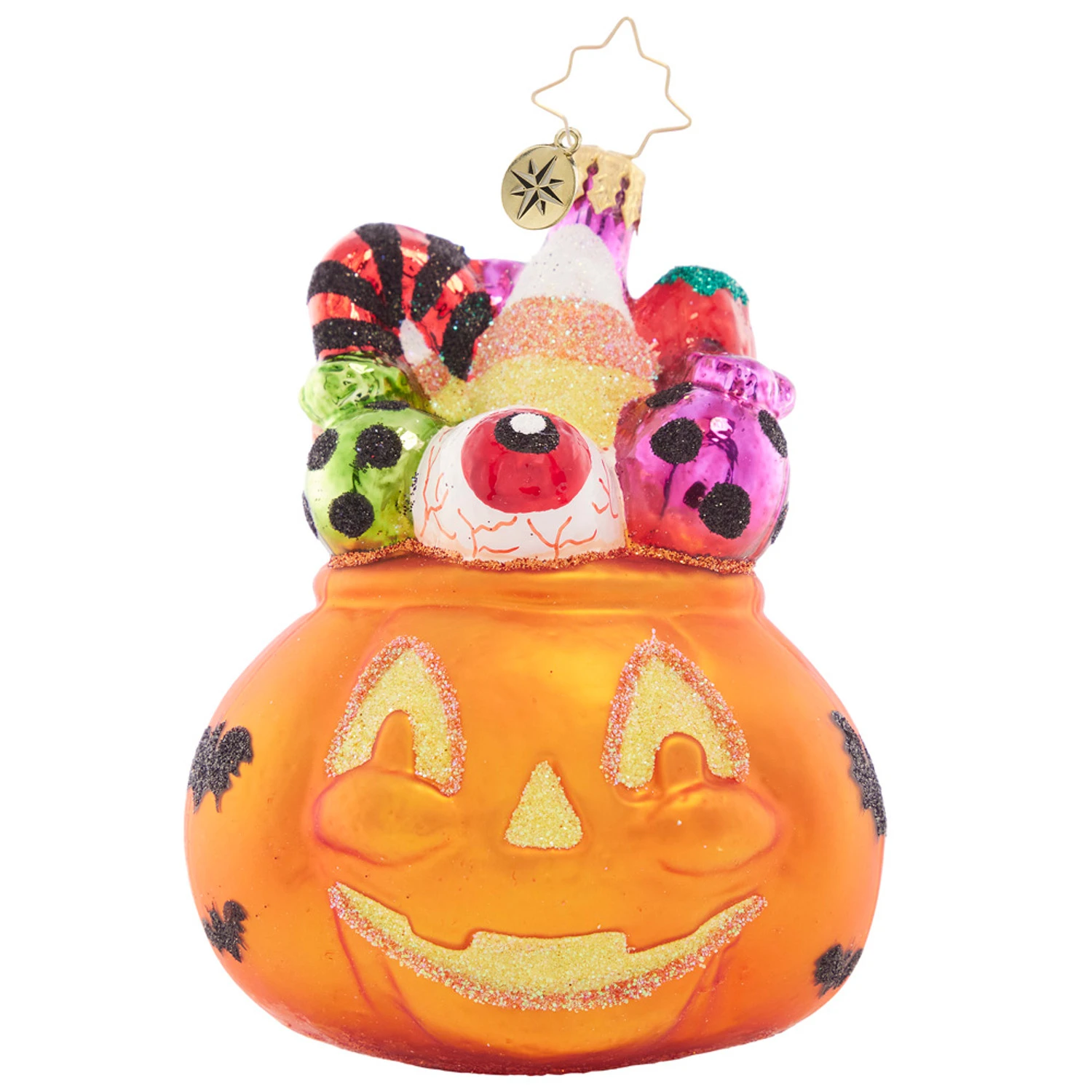 Trick or treat! Smell our feet! This adorable ornament features a smiling jack o lantern with a yellow moth and eyes and decorated with tiny black glittered bats! The jack o lantern is loaded down with spooky treats like candy corns, eyeball candy, and other various colorful candies! Perfect for the Halloween lover on your list! Made by Christopher Radko. Made of glass. Dimensions: 4 in (H) x 3.25 in (L) x 3.25 in (W). Item #: 1021598