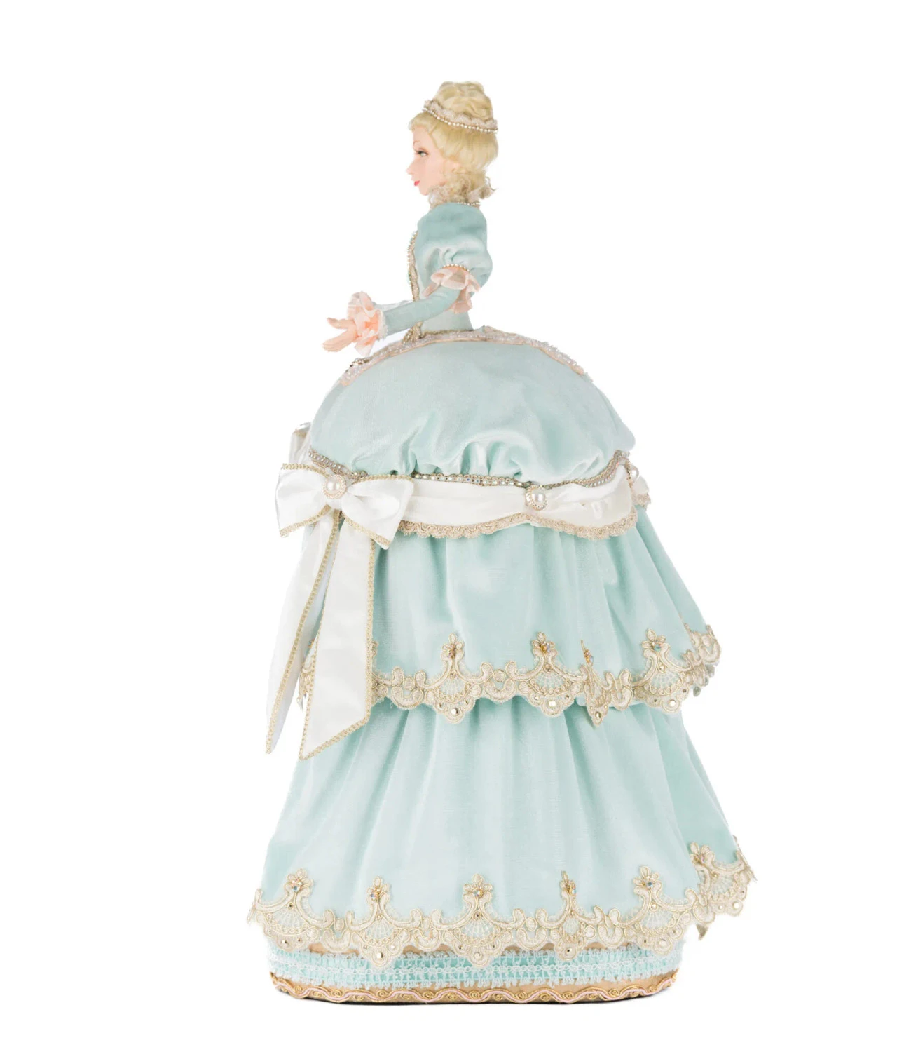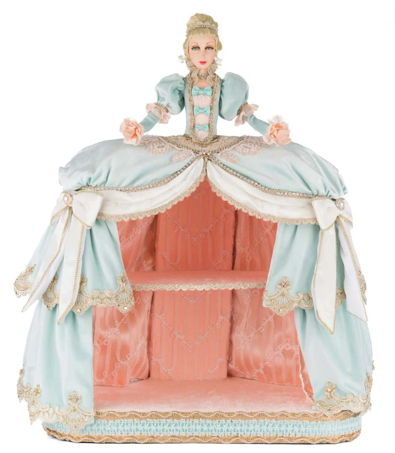 Elevate your holiday display with the enchanting Joyeux Grande Dame Server from Katherine’s Collection. This elegant blonde figure features perfectly coiffed curls, striking blue eyes framed with long lashes, and classic red lips. Her regal gown is a soft powder blue, adorned with tiers of gold-embroidered trim. The bodice features dramatic balloon sleeves with delicate pink lace ruffles and a trio of blue bows cascading down the front. Ivory bows accented with golden brooches part the skirt to reveal fabric-lined shelves—ideal for showcasing festive sweets or treasured ornaments. A truly exquisite centerpiece for your holiday décor. Made by Katherine’s Collection. Dimensions: 20.5 × 10.5 × 23 in. Item #: 28-528849