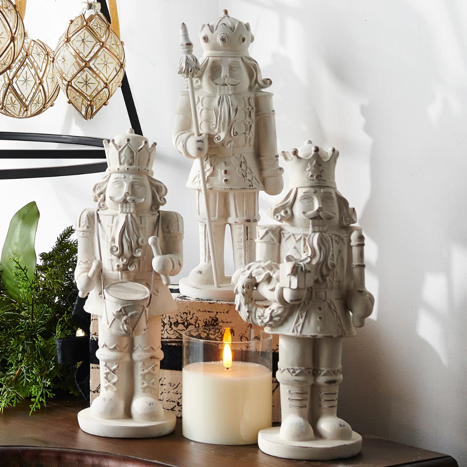 These nutcrackers feature a soft ivory finish with a distressed whitewashed look that gives them timeless charm. Each is topped with a regal crown and carries a festive item—a drum, a wreath, or a staff. Perfect for displaying on your mantle, entryway table, or bookshelf, they bring a touch of rustic elegance to your Christmas décor. Sold as a set of 3. Made by Raz Imports. Made of resin. Dimensions: 4.5″L X 4″W X 11.75″H; 5.25″L X 4.5″W X 11.75″H; 4″L X 4.75″W X 11.75″H. Item #: 4512160