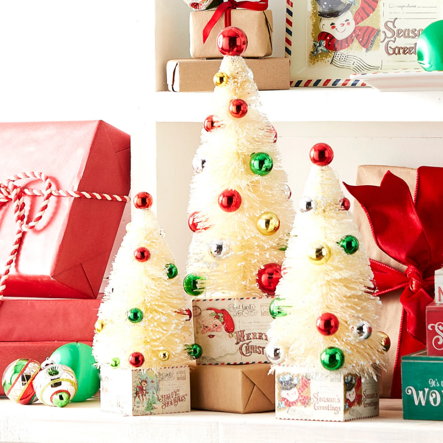 Seasons greetings! Adorn your mantle with this set of adorable bottle brush trees! Each one is dusted with silver glitter on the tips, dotted with metallic ornaments, and wrapped with tiny fairy lights! The bases are made of vintage inspired Christmas greeting cards! Requires 2 AA Batteries Each (sold separately) . 6 Hour Timer Repeats Every 18 Hours. Made of MDF and plastic. Made by Raz Imports. Dimensions: 4.75″L X 5″W X 15.5″H; 3.5″L X 5″W X 13″H; 3.25″L X 4″W X 10″H. Item #: 4316115