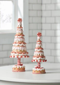 Made up of stacked cookie tiers accented with white icing and peppermint candies, these are sure to sweeten up your home! They are perfect to lace on your counter in the kitchen or on the mantle in your living room! Sold as a set of 2. Made by Raz Imports. Made of claydough and metal. Dimensions: 5.5″D X 15″H; 4.5″D X 11.25″H. Item #: 4316092