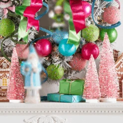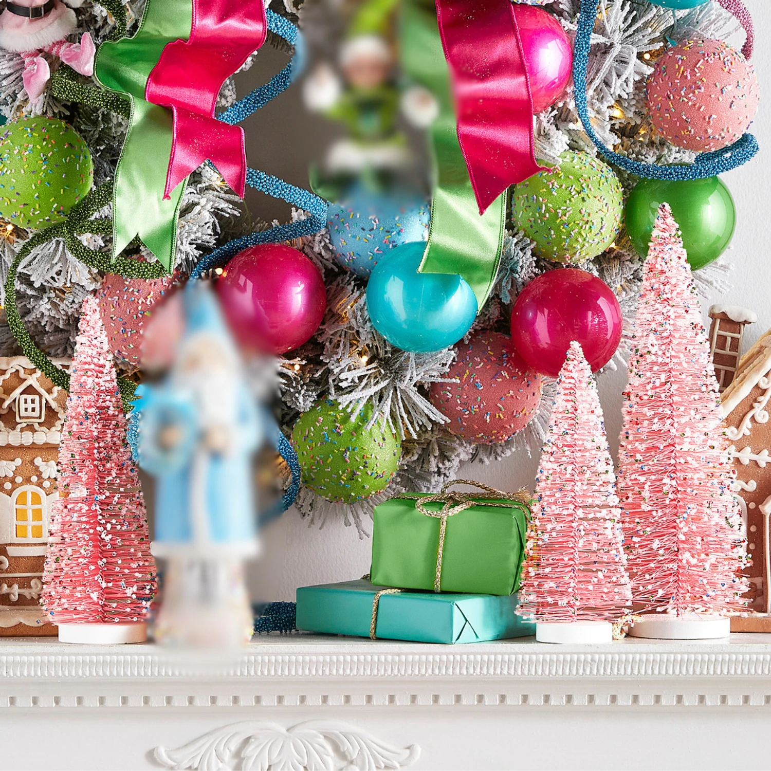 Pink is always in style, and this set of three bottle brush trees brings a playful twist to your Christmas décor with soft pink bristles dusted in colorful bead sprinkles. Perfect for adding a pop of cheer, these trees can be styled on mantels, shelves, or side tables, grouped as a festive centerpiece on your dining table, or paired with your gingerbread or other Christmas candy décor for a whimsical display that brightens your home this Christmas season. Sold as a set of 3 trees. Made by Raz Imports. Made of plastic and MDF. Dimensions: 5″D X 15″H; 4″D X 12″H; 4″D X 10″H. Item #: 4519139
