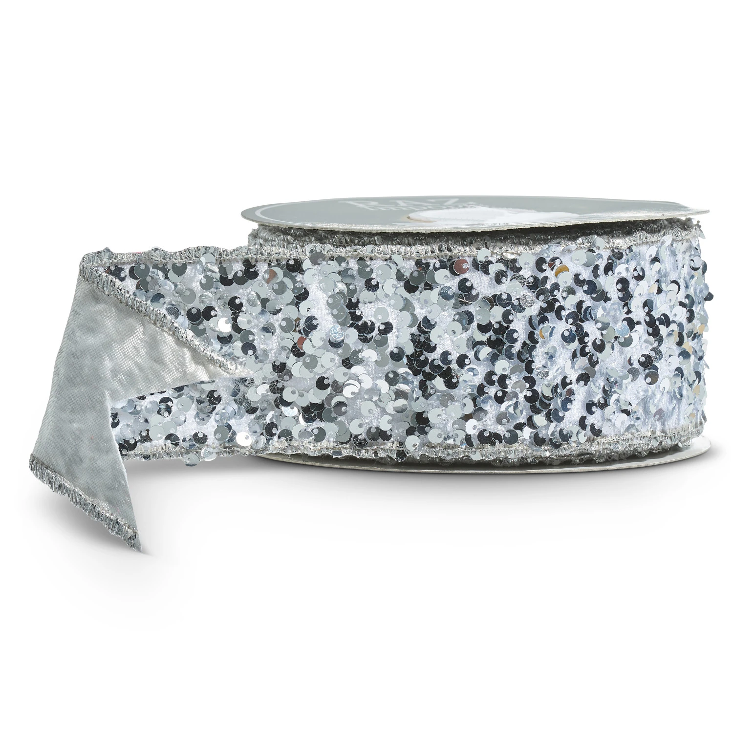 SHINE as bright as possible with this sparkling ribbon! One side is a shiny metallic silver fabric and the other is encrusted with silver sequins! Perfect to make a sparkly bow or add to your trees, wreaths and garlands. Made by Raz Imports. Made of polyester. Dimensions: 2.5″ x 10 yards. Item #: R4371760