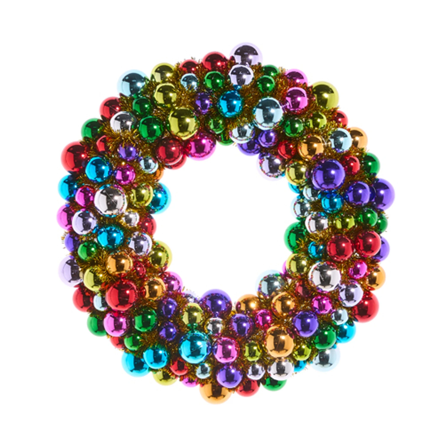 This festive 24″ wreath features a vibrant mix of colorful ball ornaments arranged in a full, eye-catching circle. Sparkling gold tinsel is woven between the ornaments, adding shimmer and a touch of vintage charm. Perfect for hanging on your front door, wall, or above your mantel, it instantly brightens your Christmas décor. A cheerful and classic way to bring holiday sparkle into any space. Made by Raz Imports. Made of plastic. Dimensions: 24″. Item #: W4516427