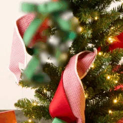 This stunning double-sided ribbon features two complementary red and white plaid designs, finished with a crisp white trim for a clean, classic look. The wired edges allow for perfectly sculpted bows and effortless shaping—ideal for looping through your Christmas tree, accenting garlands, or creating standout wreath designs. A versatile staple for traditional and modern holiday decor alike. Made by Raz Imports. Made of polyester. Dimensions: 4″ x 10 yards. Item #: R4527814