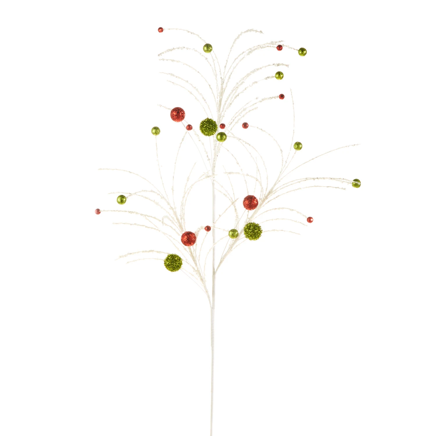 F-U-N describes this awesome Christmas spray! It features a white glitter stem with a spray tipped with glittered dark green and red balls! Perfect for adding to your Christmas tree, garlands or wreaths. Made by Raz Imports. Dimensions: 42″. Item #: F4302500