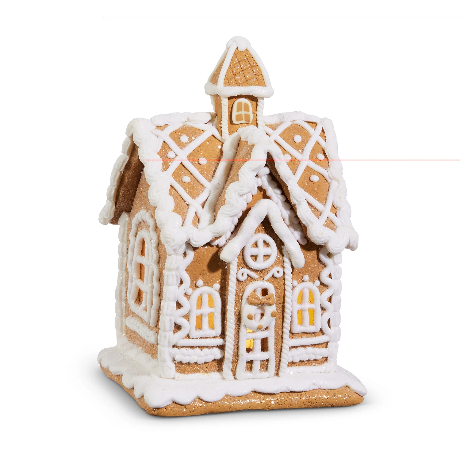 Add a sweet and whimsical touch to your Christmas decor with this lighted gingerbread house from Raz Imports. Standing 7.75″ tall, this charming piece features classic brown “cookie” walls, delicate white icing-style piping, and a warm glow that shines from within—creating the perfect holiday ambiance. Place it on your kitchen counter while baking cookies, style it with other gingerbread accents on a tiered tray, or add it to your Christmas village display. Whether you’re going for a cozy cottage core vibe or a candy-themed wonderland, this delightful house brings festive cheer wherever it’s placed. Made by Raz Imports. Requires 3 AA Batteries, not included. 6 Hour Timer Repeats Every 18 Hours. Made of claydough. Dimensions: 5.25″ L X 5″ W X 7.75″ H. Item #: 4416148