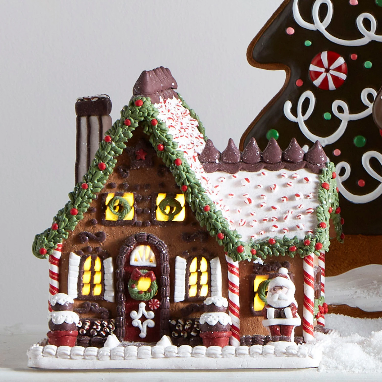 This delightful gingerbread house features cookie walls accented with peppermint stick beams and chocolate-trimmed windows! The roof is covered in white icing and sprinkled with crushed peppermint, while chocolate kisses line the peak. Fluffy green garland piped with red berries trims the roof, potted cakes sit by the front door, and Santa stands cheerfully outside. A soft glow from within adds the perfect cozy touch—place it on your kitchen counter, entryway table, or as a centerpiece on your holiday dining display! Requires 3 AA Batteries, not included. 6 Hour Timer Repeats Every 18 Hours. Made by Raz Imports. Made of clay dough. Dimensions: 9″ L X 6.5″ W X 8.75″ H. Item #: 4516665