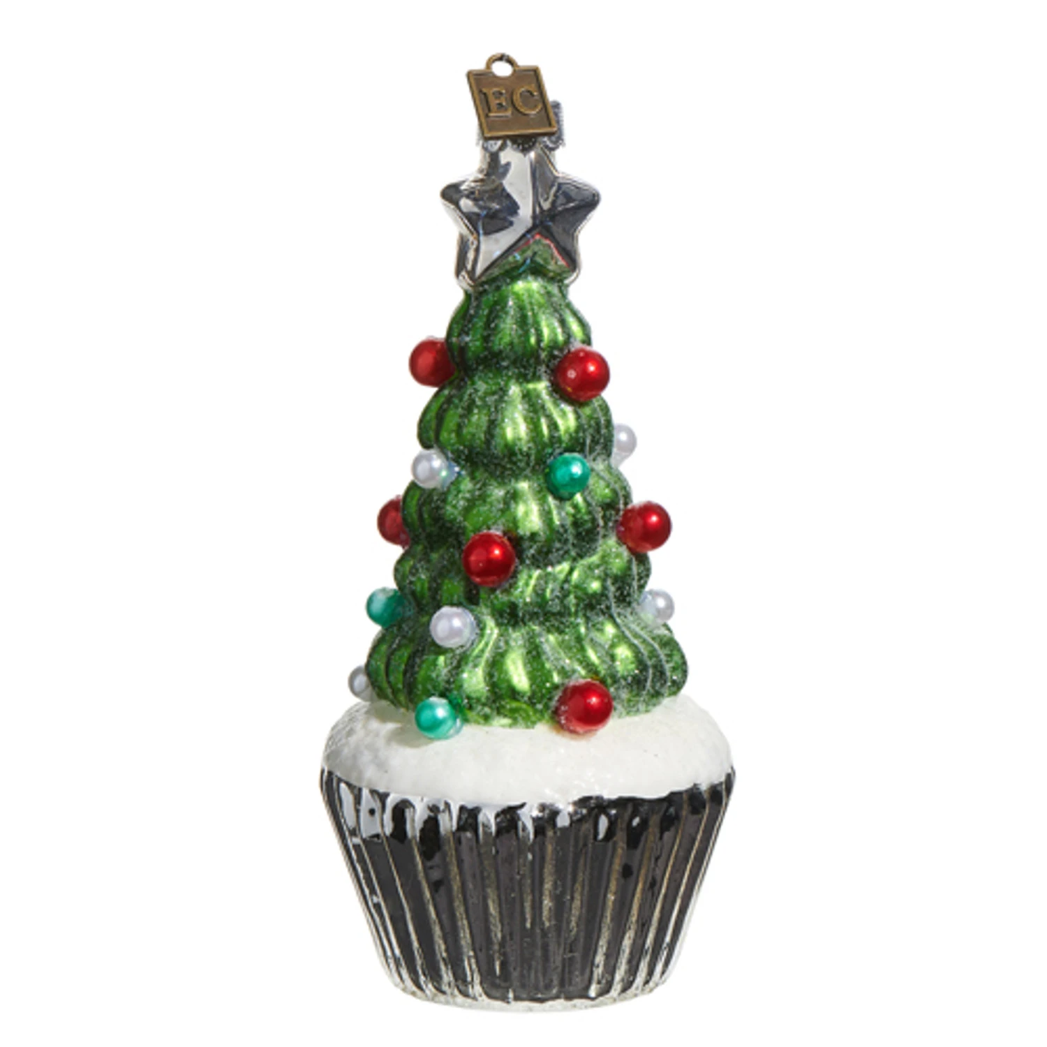 Yum! Yum! A silver wrapper topped with white glitter and a mound of green icing decorated with little beads and topped with a star! Made by Raz Imports. Made of glass. Dimensions: 2.5″ D X 5.5″ H. Item #: 4553169