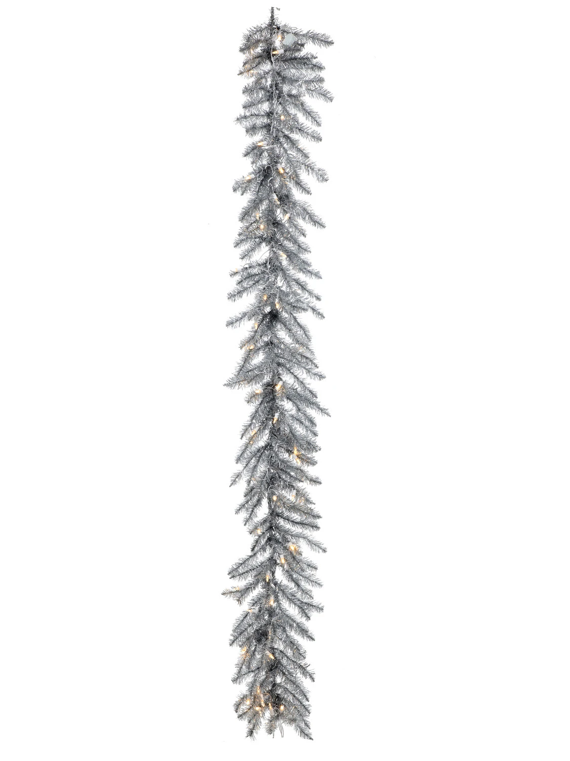 A silver Christmas garland is exactly what your mantle is missing! This piece is made of sparkling silver tinsel branches and wrapped with white LED lights! All you have to do is hang it and decorate it! Made by Regency International. Dimensions: 6′ x 12″. Item #: MTX70068L